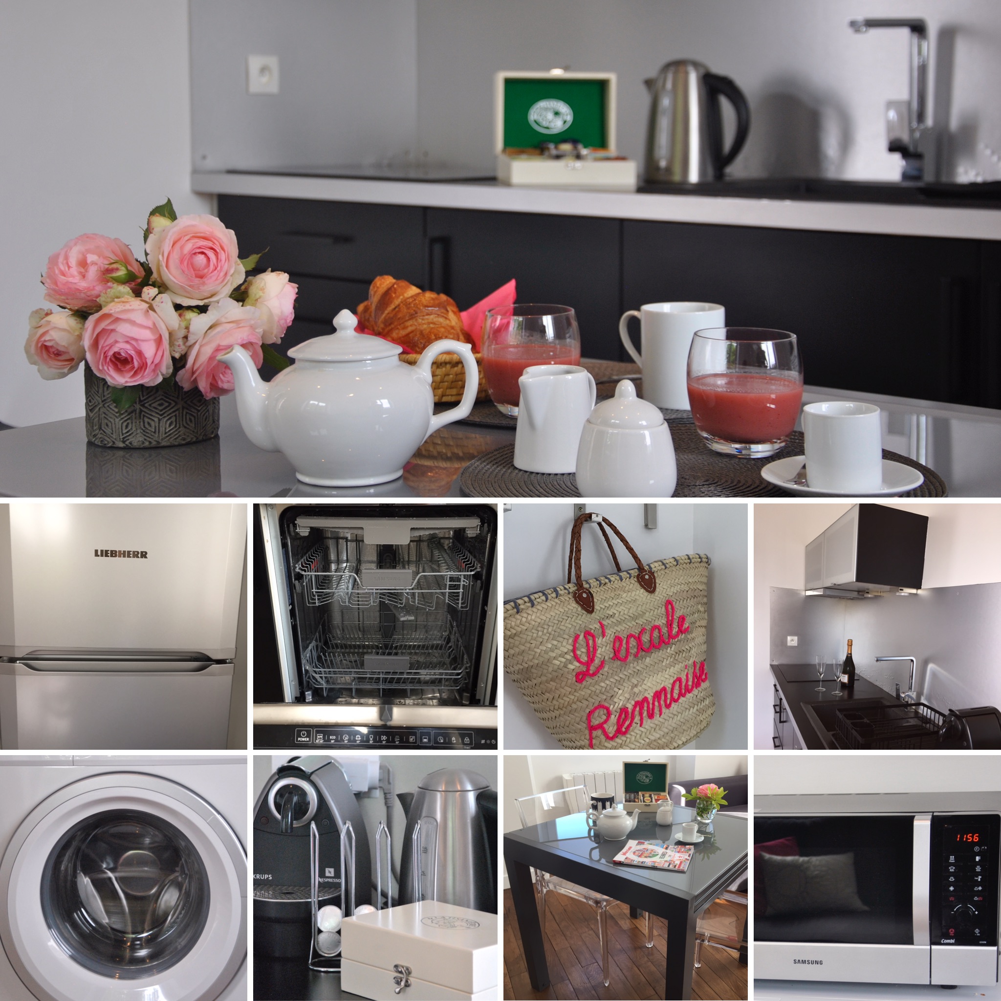 L'espace cuisine est bien équipé : plaques de cuisson à induction, un four mixte (traditionnel et micro-onde), cafetière Nespresso, cafetière électrique, bouilloire, grille-pain, réfrigérateur-congélateur, lave-vaisselle.